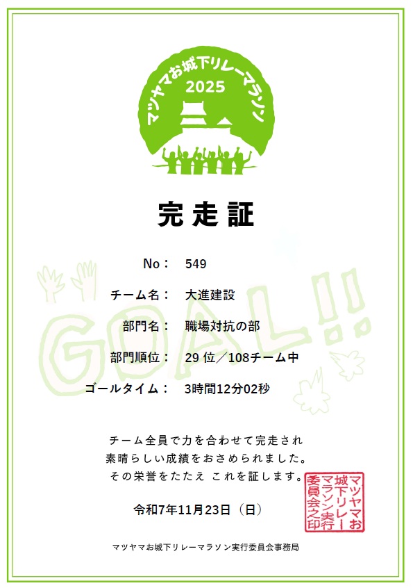 2025.11.26⭐お城下リレーマラソン2025出場!!⭐ 今年も出場させていただきました!!みなさんお疲れ様でした!! ⭐ ブログ ⭐⭐お城下リレーマラソン2025出場!!⭐ | 大進建設 ⭐ インスタ ⭐⭐お城下リレーマラソン2025出場!!⭐|Instagram PREV 一覧に戻る